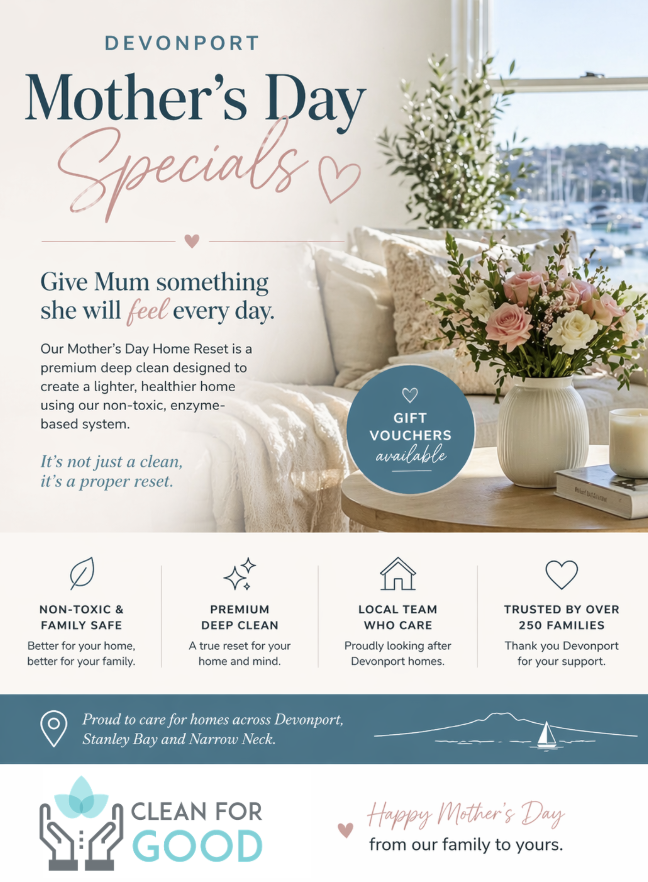 Devonport has been at the heart of Clean For Good's business since day one. This Mother's Day, they're offering a small number of Home Reset deep cleans for local families who want to give Mum a home that feels lighter, healthier, and properly cared for. Using their non-toxic, enzyme-based system, it's more than a clean, it's a proper reset. Gift vouchers available throughout May.
